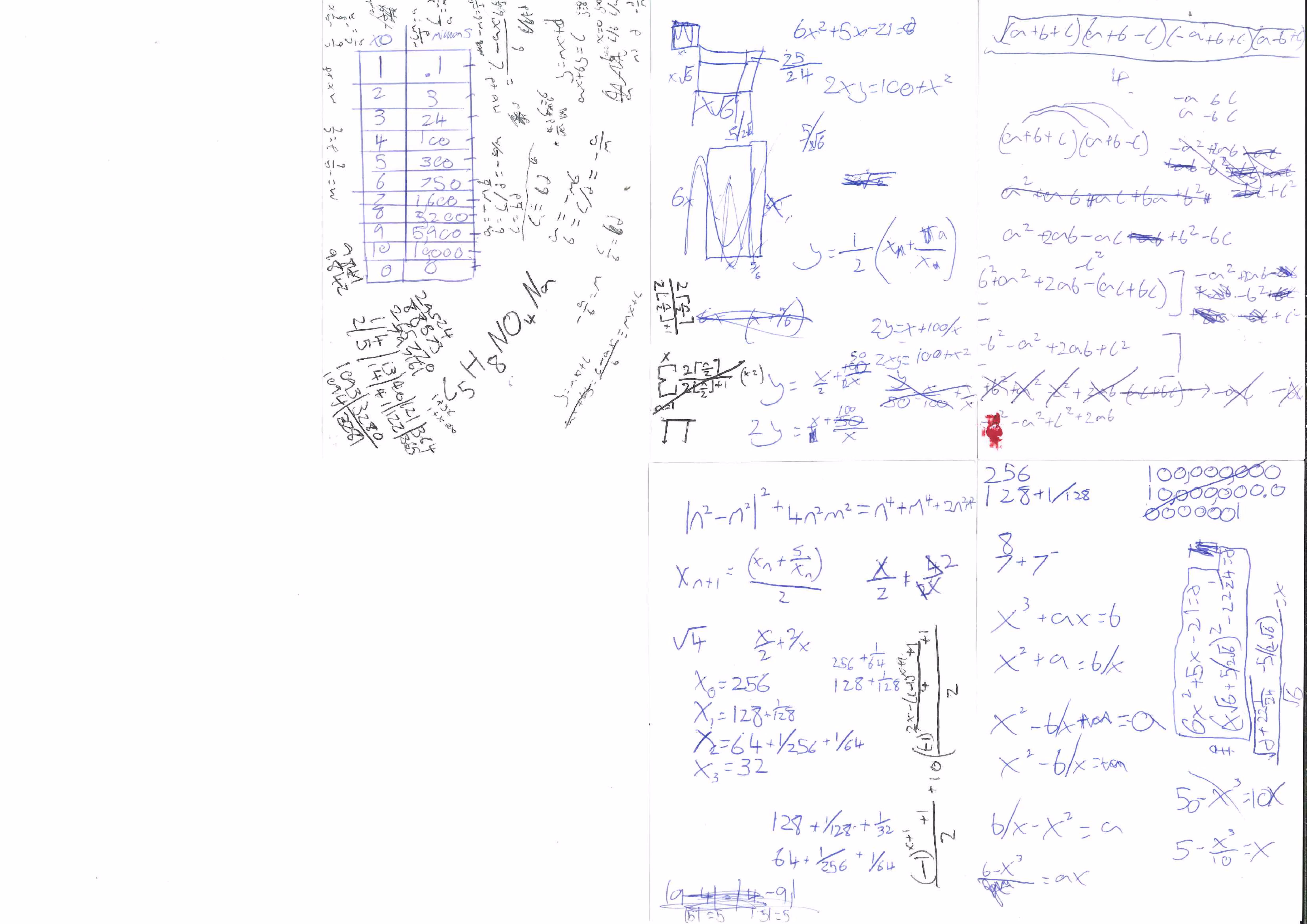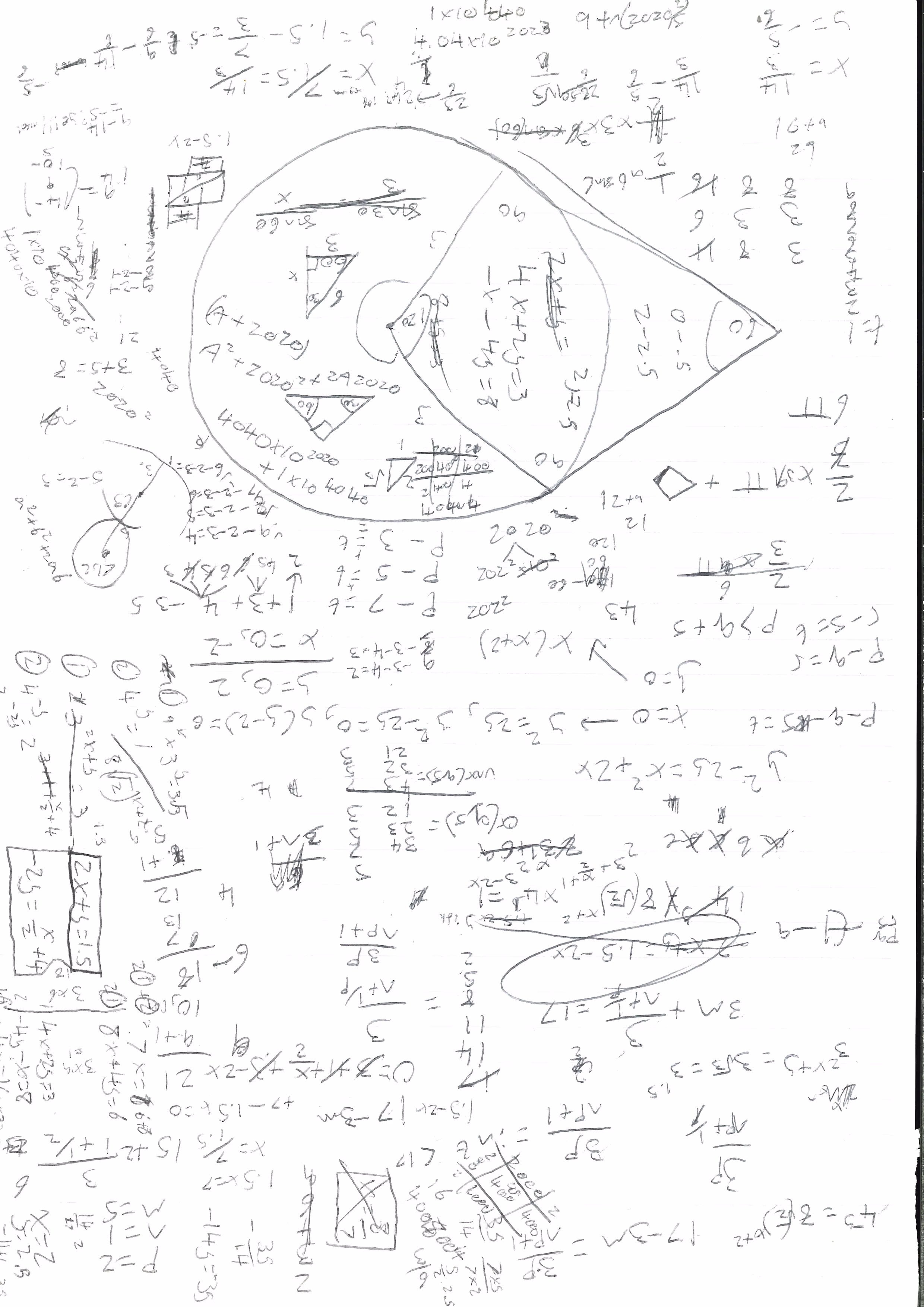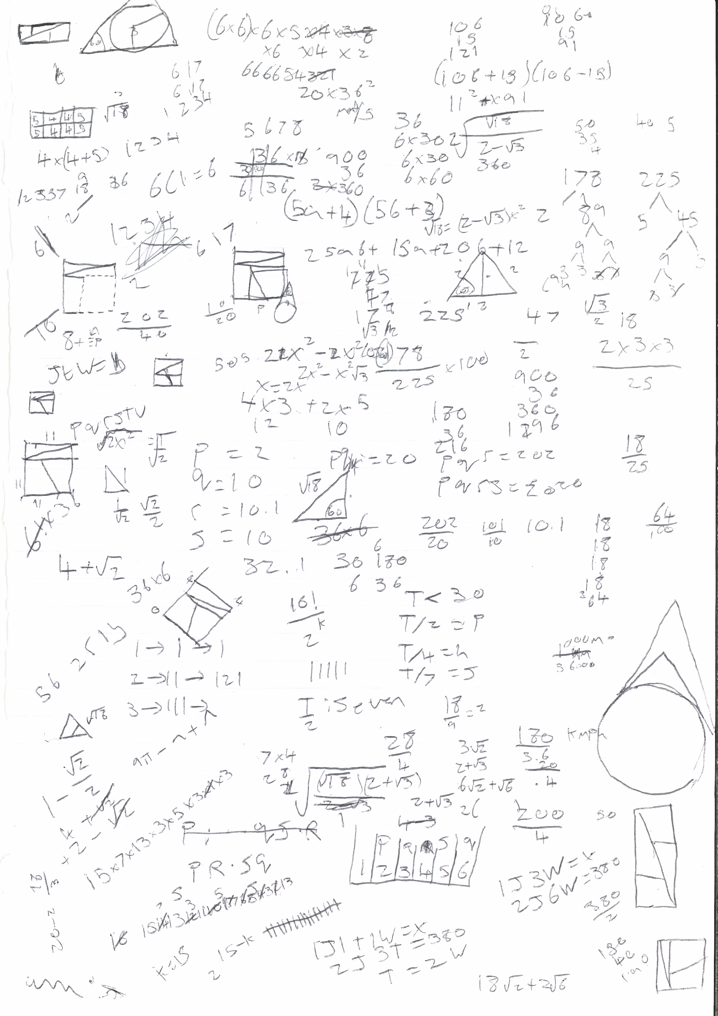 Sheet 0 is composed of densely packed geometric diagrams and arithmetic, which are, based on handwriting, only from one author (author A). We can clearly see a number of constructions using squares subdivided into triangles and trapezia, mostly with associated side lengths or numbers; oddly, some lack this, suggesting that they were either obsoleted by other diagrams or never intended to provide numerical results in the first place. As well as standard arithmetic operations like division, addition and multiplication being shown, the sheet contains stranger things like successive powers of 11 and sequences of 1 digits being shown together, prime factorization, nested square roots, and unexplained products or tables of variables. It seems most likely that this was used as scratch paper for competition mathematics problems, which tend to be heavy on geometry and somewhat unconventional but conceptually simple uses of arithmetic.