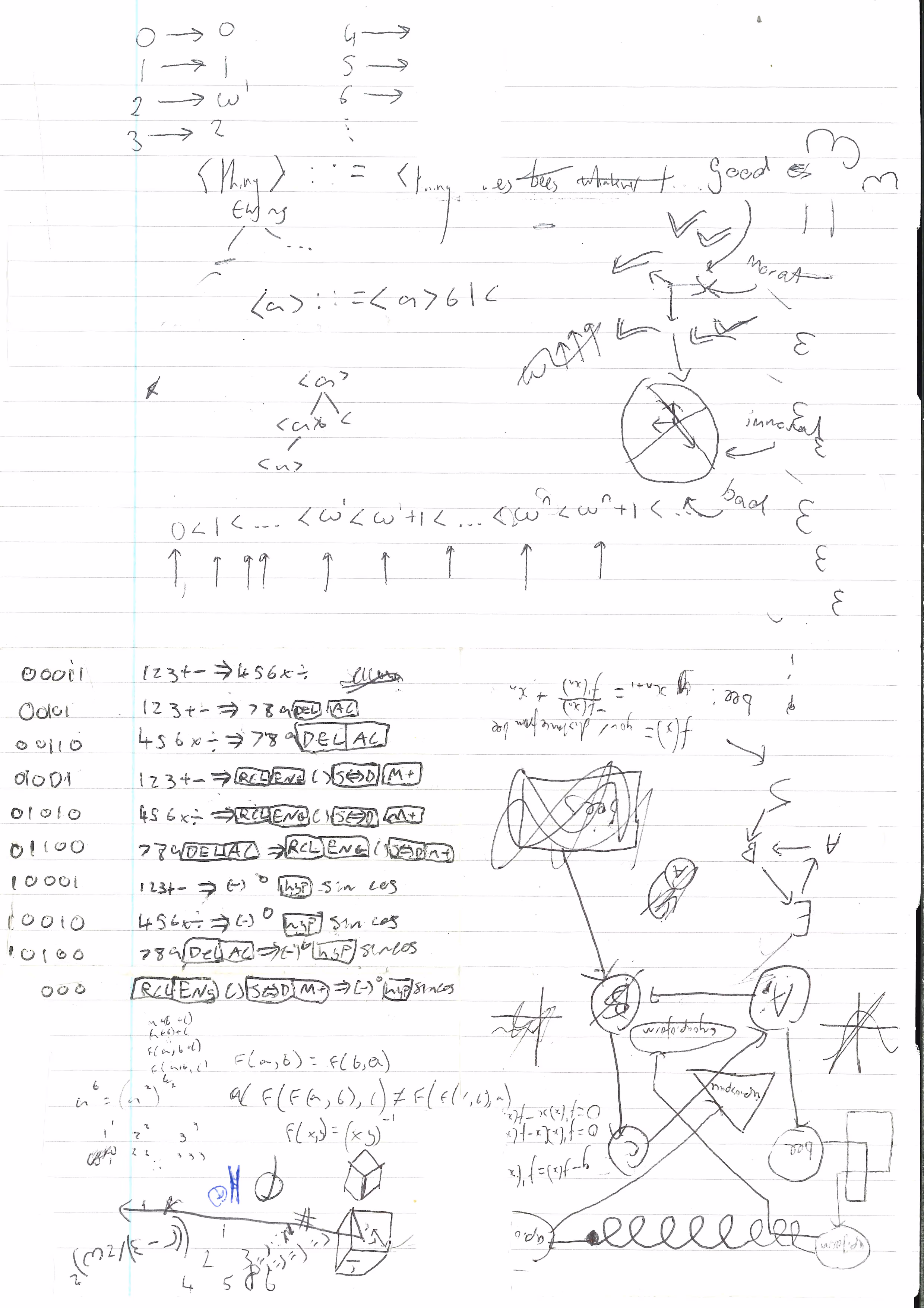 Sheet 2 is obviously very different to its predecessor. There is evidence of at least two other authors here, due to the differences in handwriting, as well as the possibility that the paper was used folded up due to its division into quarters in the bottom half. The paper has also suffered physical damage at some point: the top and bottom have pieces torn out, consistent with the folding theory, although the shape of the removed pieces is unusual. It's plausible that they were intended to redact a specific part for some unknown reason. The top half contains some preliminary work on ordinal theory by author B, as well as some descriptions of grammars by both B and C. The binary numbers and button symbols in the bottom-left match those of popular Casio handheld calculators, and seem to be an analysis of its keyboard scanning with the intent of allowing some buttons to be substituted for combinations of others, written by author A. Right of this is a statement of Newton's method for numerical root-finding, and as well as a graph-theoretic diagram including a spring/inductor for unknown reasons, part of another expression involving derivatives (possibly a derivation of Newton's method); these are all written by author C. Finally, near some miscellaneous shapes and unconnected numbers, author A defines a commutative, nonassociative function. This, then, has been used for general-purpose mathematics working by multiple people.