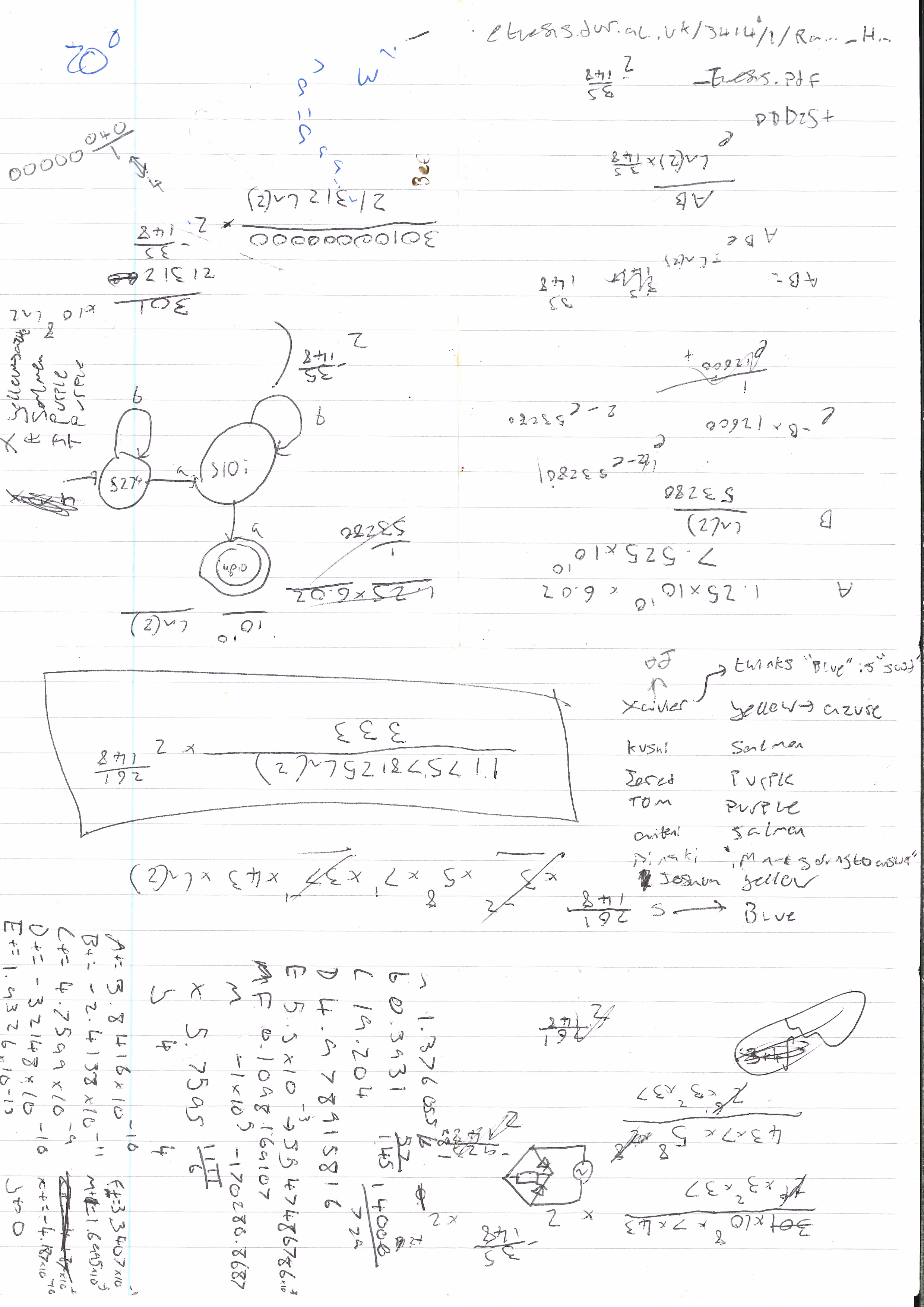 Sheet 4 has again been used in quarter segments, which is now especially obvious due to the visible-in-scanning creases. Its contents are now almost entirely by author A, except for ambiguous parts and an area clearly by C - a finite state machine recognizing an unknown language. Along with the arithmetic working typical of the Chaos Papers, a table in the middle-right maps a selection of names to colors - some have multiple colors delimited with an "→", so perhaps this is indicating change in color preference over time. This is clearly an attempt at analyzing the psyche of some test subjects. The top-right also contains a partial URL which, reassembled, points to a PhD thesis on "Spectroscopic and Microscopic Characterisation of Carbon Nanostructures". The motive for this is unknown at this time, although we speculate that this could be part of work by the Chaos Papers' authors to acquire a more durable carbon-nanotube-based writing surface - or, more worryingly, to build a space elevator, perhaps in order to access the Moon to transfer the Papers' content to it, a move which could have disastrous consequences for humanity.