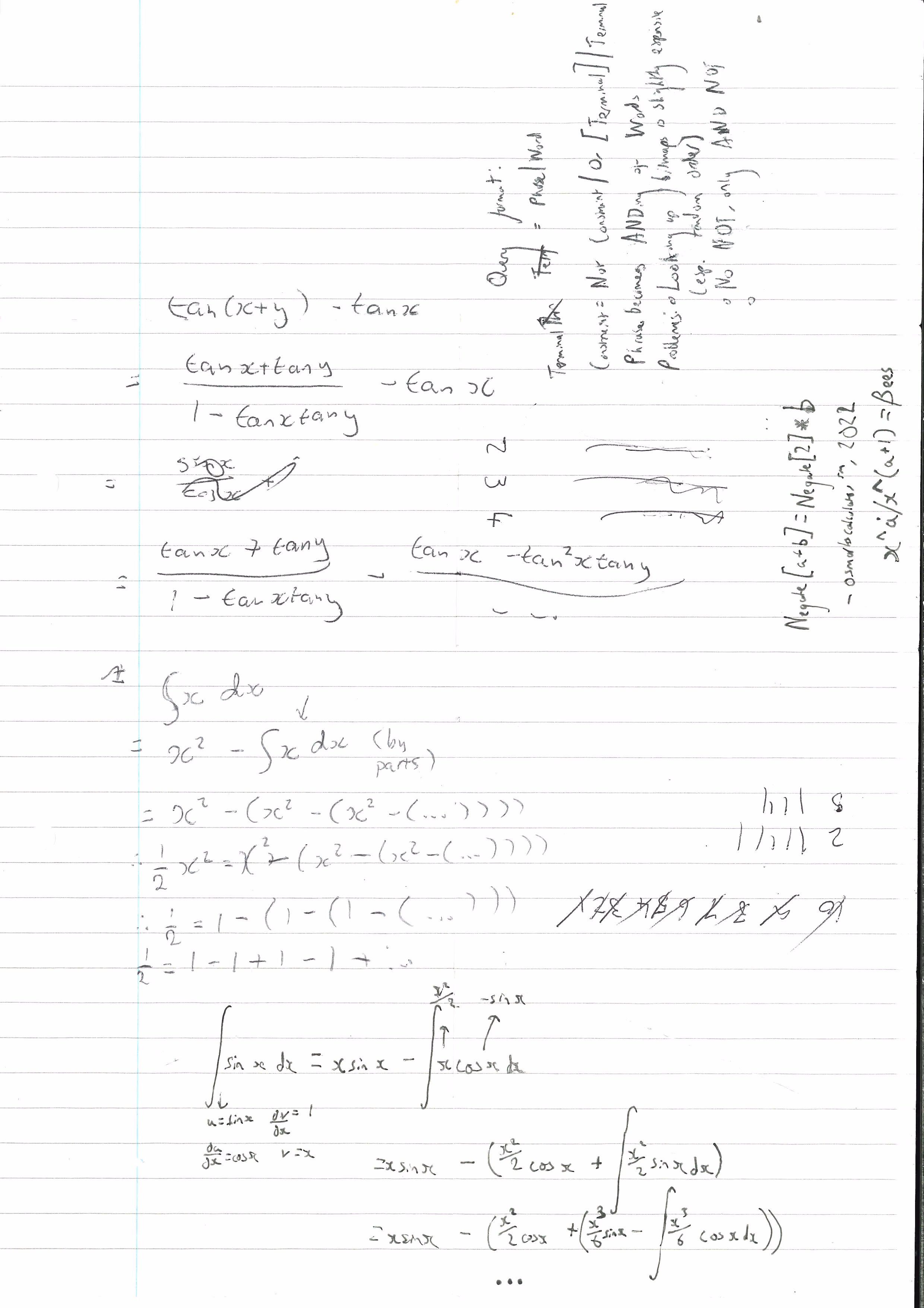 The content on the reverse is not at all related to Sheet 4's content. As well as Author B's algebraic manipulation of the "tan" compound angle formula, standard for a Chaos Paper, Author C seems to have been debugging a calculator program called "osmarkscalculator" (notably similar to the name of "osmarks"), although despite use of multiple search engines no evidence of this program has been found; they have also been designing a primitive language for writing search queries. The bottom half of the paper is more interesting, containing a potentially-novel proof of the infinite series "1+1-1+1-1+1..." equalling 1/2 through infinite integration by parts (by author B) and what appears to be a similar aborted attempt by author C to do the same with sine/cosine functions.