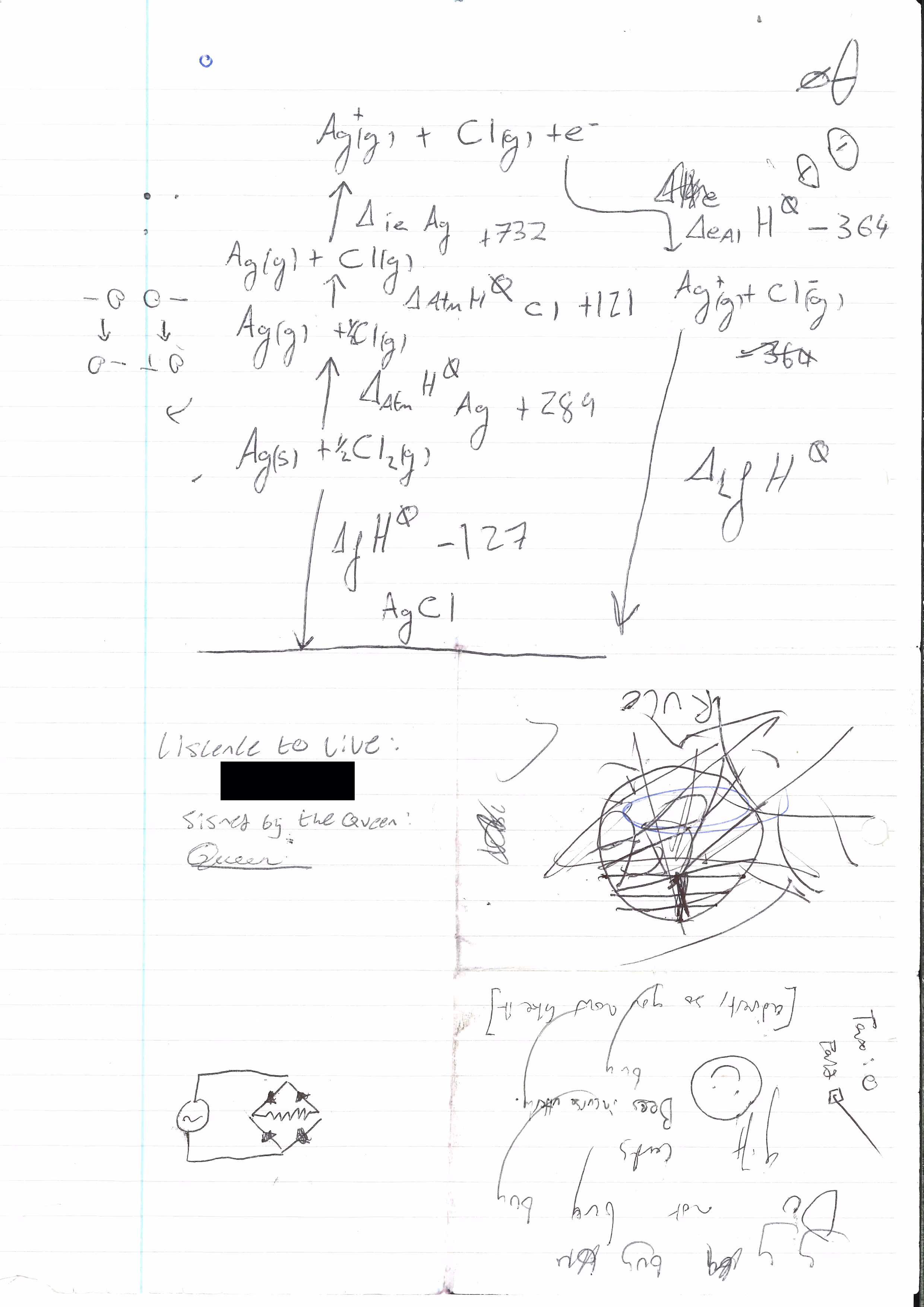 While more heavily creased, Sheet 6 doesn't seem to have been used as heavily as the previous sheets. The top part contains Author A's work on an electrochemical reaction involving silver and chlorine, as well as a signed "Licence to Live" from the Queen. It is unknown at this time which Queen this refers to, but in case this is the Queen of the United Kingdom of Great Britain and Northern Ireland, the implications for geopolitics would be substantial - subversion of national governments by the Chaos Papers' authors could result in a ΛK-class scenario by as early as 2033. A diagram of a full-bridge rectifier is found below this, implying highly advanced of electrical engineering, troublingly. Finally, Author C has used the bottom-right corner to write a short memetic agent apparently designed to induce disdain for gift cards. The exact cause of this is unknown, but we theorize that this might be related to an attempt to destabilize the economy to acquire greater control of industry.