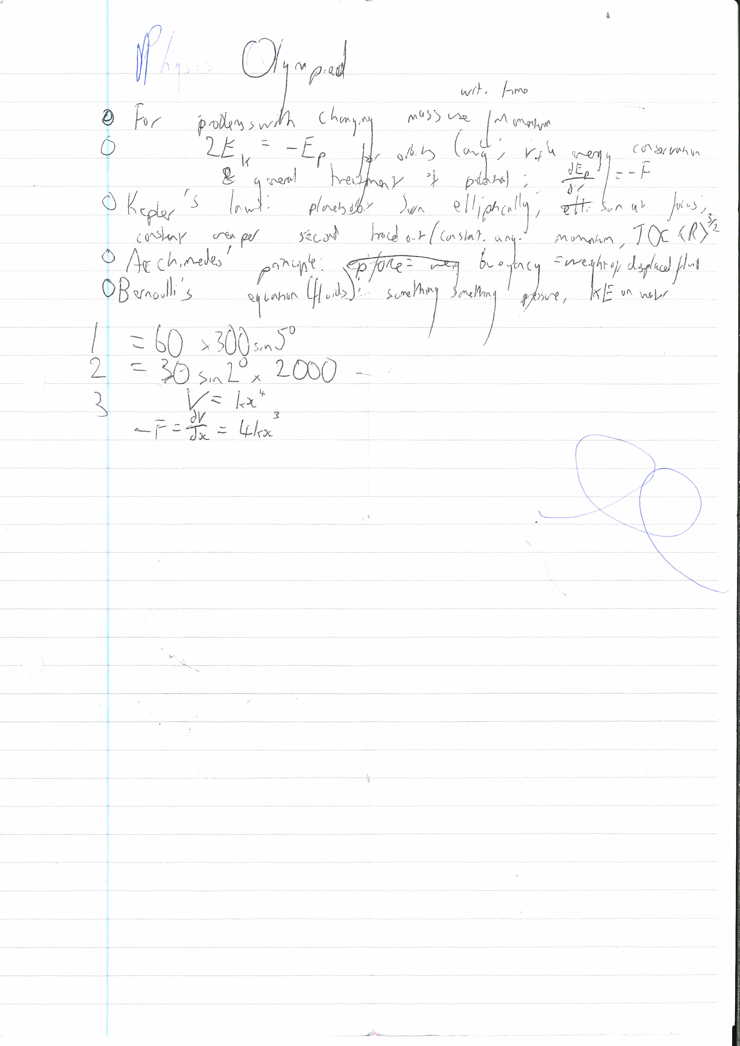 Sheet 7 breaks from the trend of previous papers, containing only the contributions of Author C, in a relatively regular format. The title is somewhat damaged because of what looks like an emptied pen, but "Physics Olympiad" is still readable with enough image enhancement. The content below corroborates this - it looks like notes on physics concepts relating to rocketry and fluids, as well as short pieces of working which may be related to this. We believe this supports our theory that the authors intend to conquer the Moon or other celestial bodies for their own purposes.