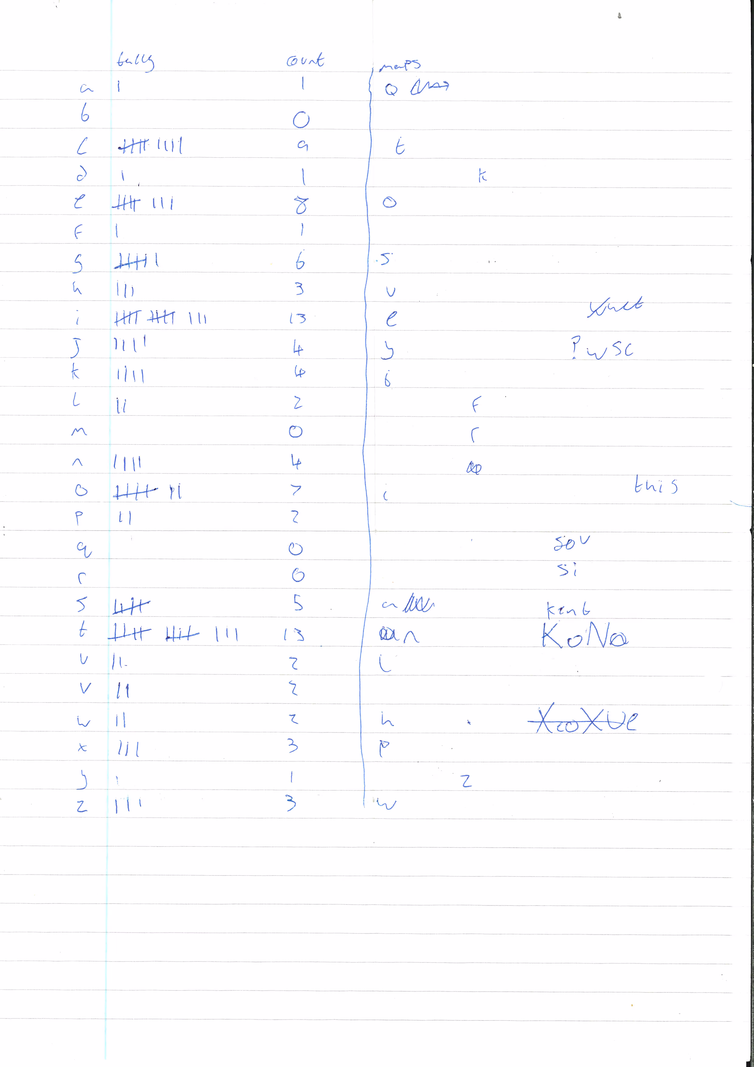 This sheet contains what appears to be a highly sophisticated, partially-completed attempt to decode a substitution cipher. We believe that given the obvious importance of the data being decoded, this attempt would only have been abandoned if an even better method was available - the codebreaking skill this suggests means that it may be necessary to advance plans to move to more advanced methods of secure communication, such as carrier pigeons, Facebook or the Vigenère cipher.